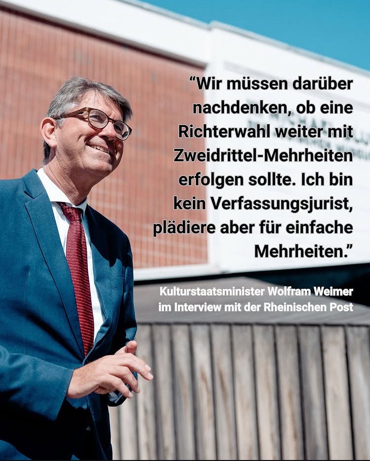 Auf dem offiziellen Account des Beauftragten der Bundesregierung für Kultur und Medien, wird mitgeteilt, dass sich Wolfram Weimer in der aktuellen Debatte über das Wahlverfahren für Richter:innen am Bundesverfassungsgericht (BVerfG) für einfache statt Zweidrittel-Mehrheit einsetzt.