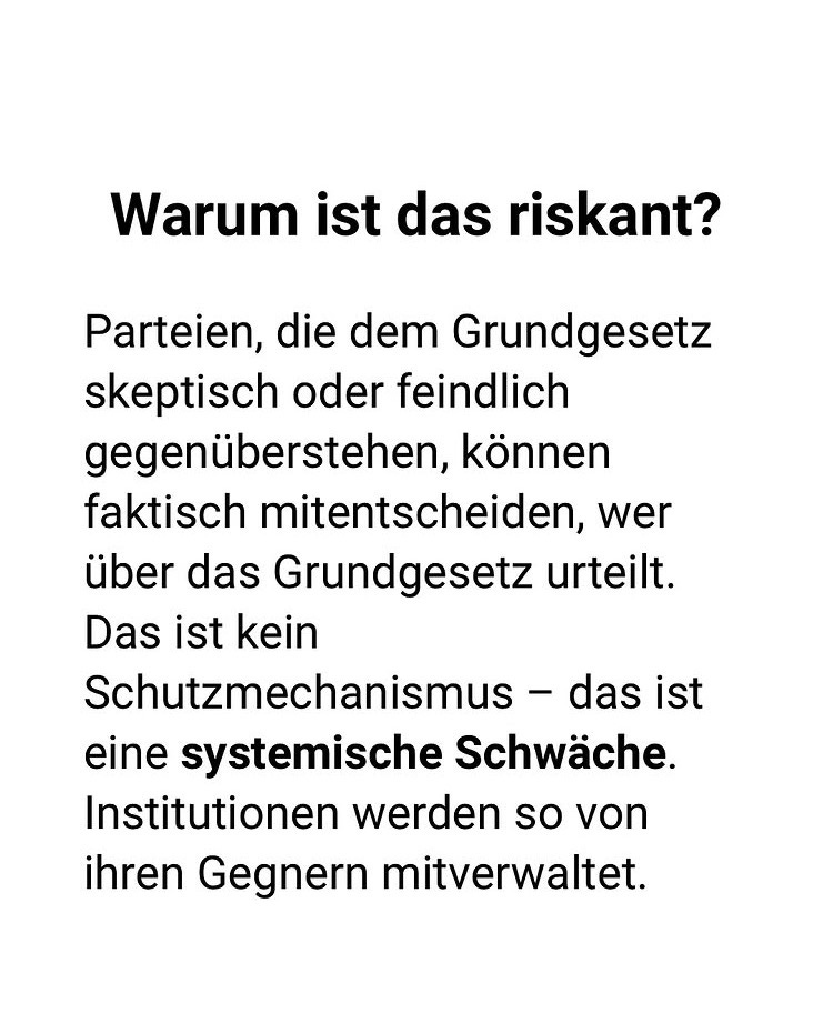 Eine einfache Mehrheit bei der Wahl der Richter:innen des Bundesverfassungsgerichts birgt mehrere Risiken, wie eine einseitige politische Besetzung, daraus folgende US-amerikanische Verhältnisse wie beim Supreme Court zu besichtigen und daraus folgend sowohl der Verlust überparteilicher Legitimation als auch erst recht die Ermutigung autoritär-populistischer Kräfte, sprich der AfD.